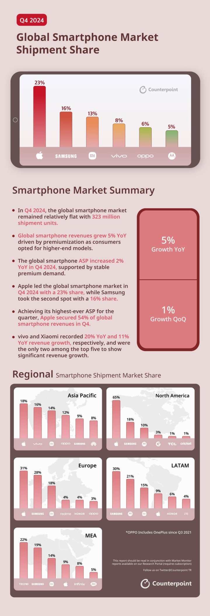 苹果在2024年第四季度继续领跑全球智能手机市场,占据23%的市场份额。同时,苹果创下了季度最高ASP,并凭借这一优势拿下了全球智能手机总收入的54%。